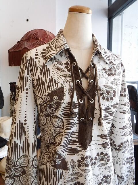 ヨーロッパ古着 brown off white retro graphic open collar lace up design 1960-70's dress