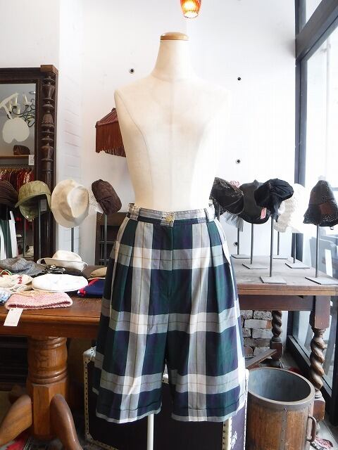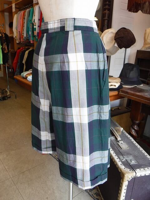 ヨーロッパ古着 moss green white yellow tartan plaid tucked short pants
