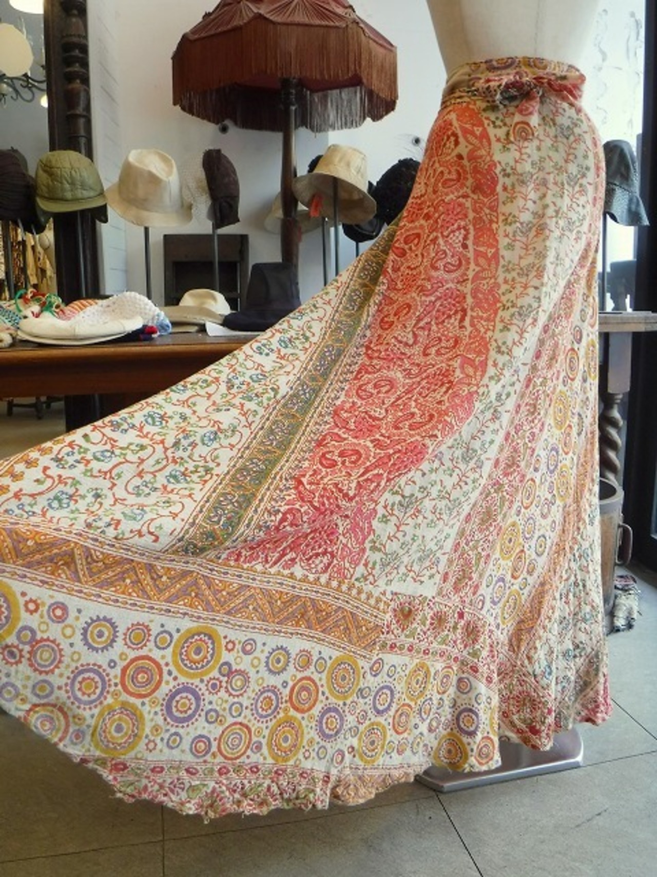 ヨーロッパ古着 orange ivory tone Indian cotton maxi wrap skirt