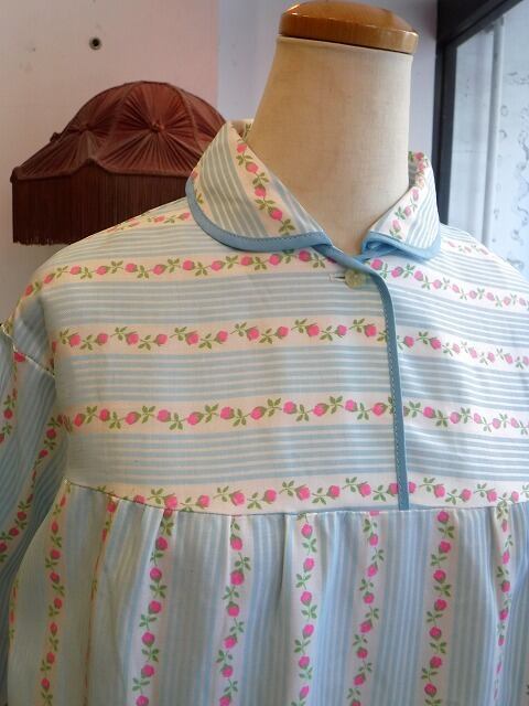 ヨーロッパ古着 pale blue white bright pink stripe and rose PJ dress