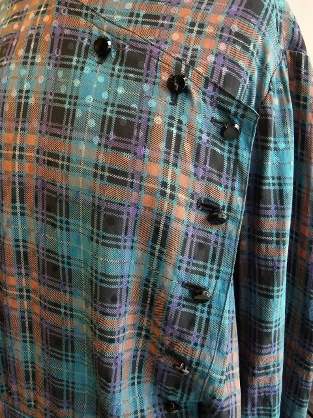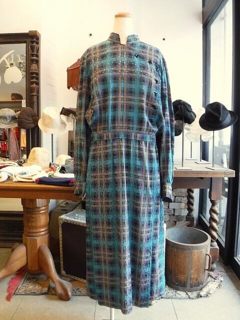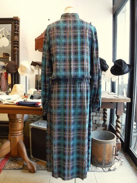 ヨーロッパ古着 shimmar green brown tone plaid mao collar classical dress