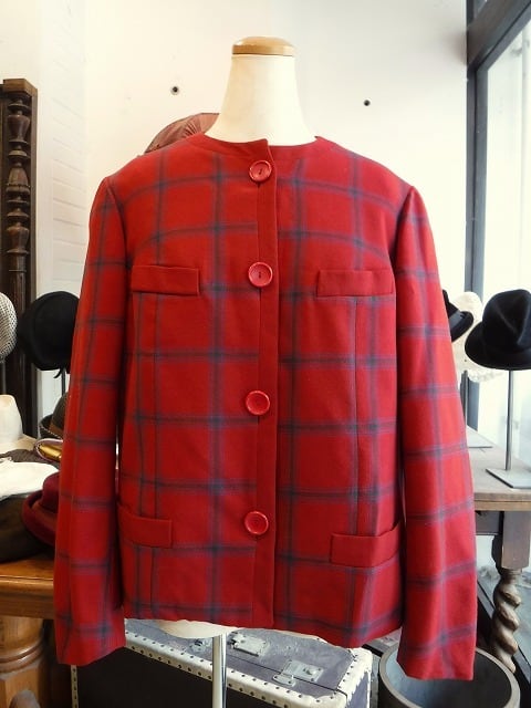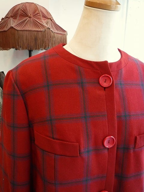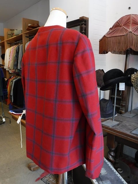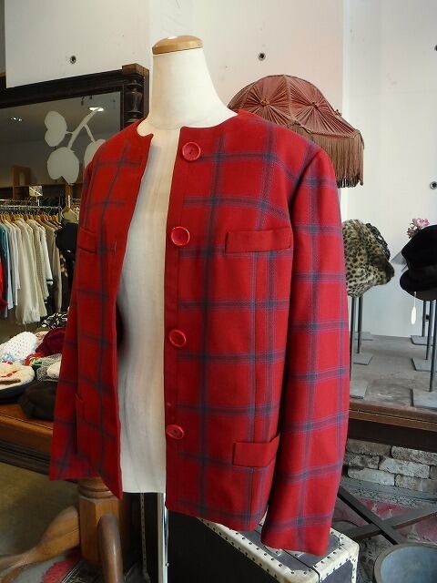 ヨーロッパ古着 red green blue block plaid no collar jacket