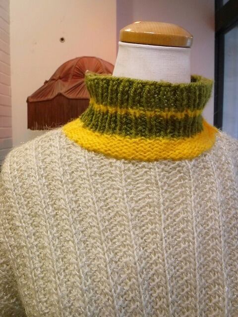 ヨーロッパ古着 glittery beige green yellow line high neck knit pullover