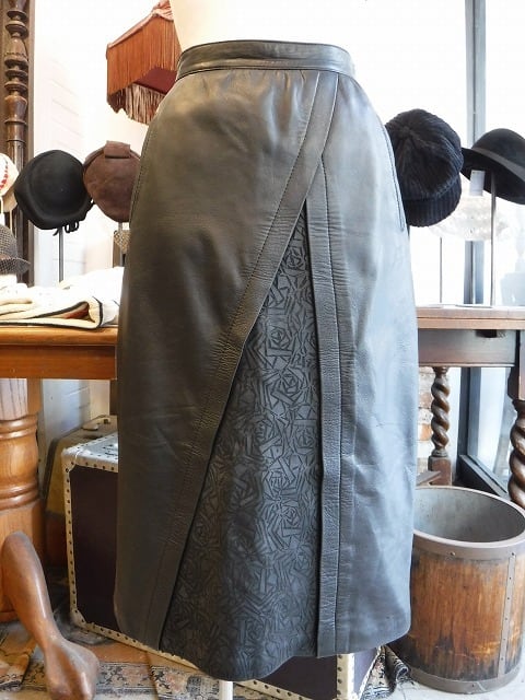 ヨーロッパ古着 black layered design 1980's tight leather skirt