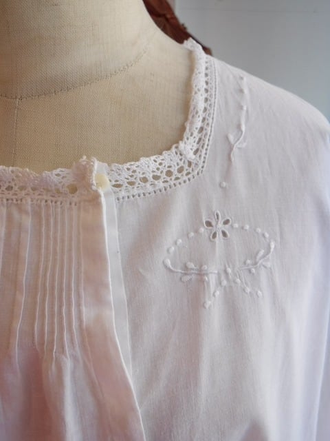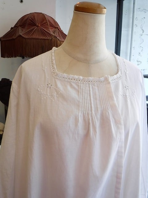 ヨーロッパ古着 around 1930 crochet laced square neck long sleeve white cotton nighty