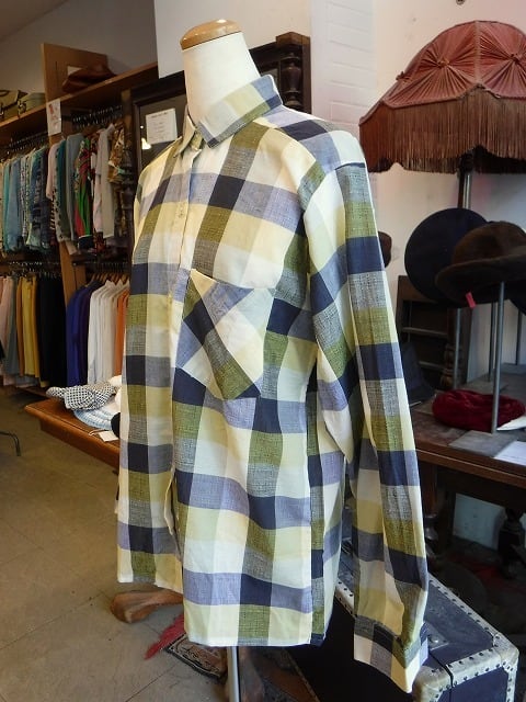 ヨーロッパ古着 pale yellow navy block graphic 1970's shirt