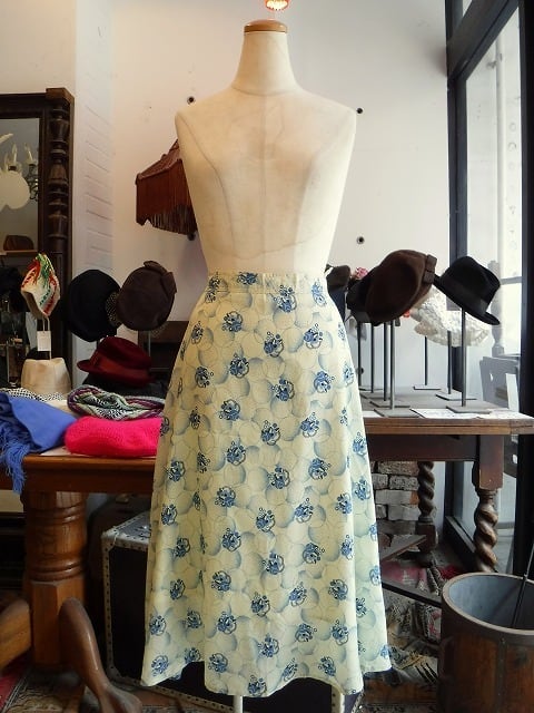 ヨーロッパ古着 shimmar ivory blue ○ and floral flare skirt