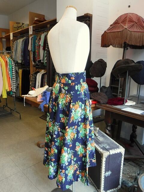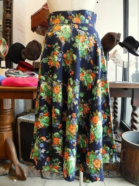 ヨーロッパ古着 navy neon orange green floral high waist flare skirt