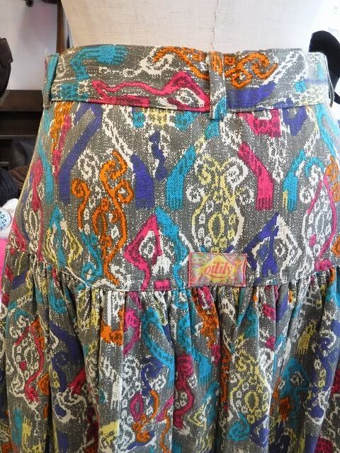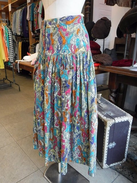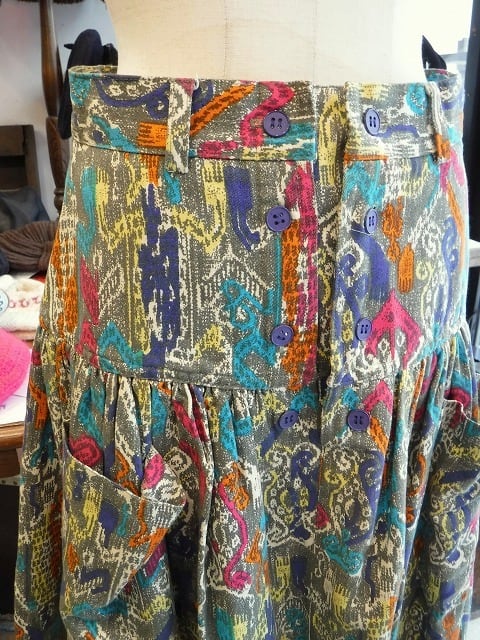 ヨーロッパ古着 gray yellow pink blue tribal graphic 80's volume skirt